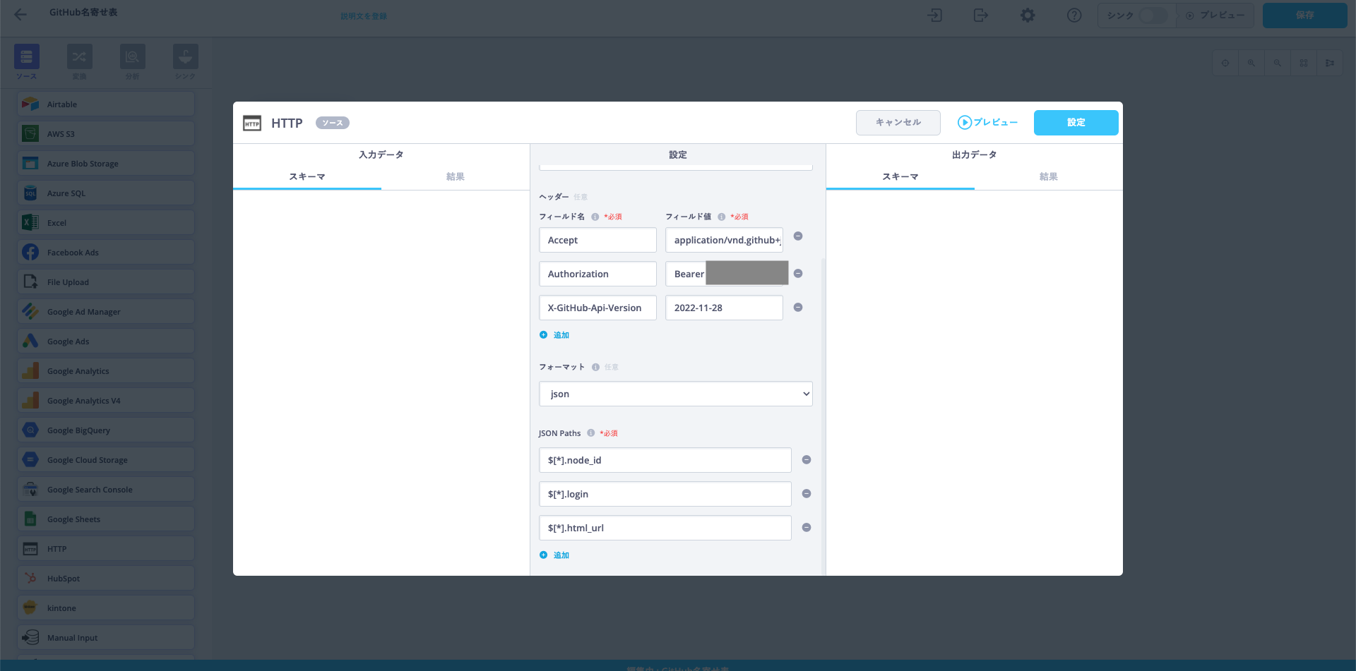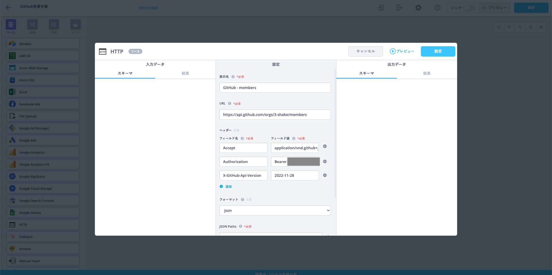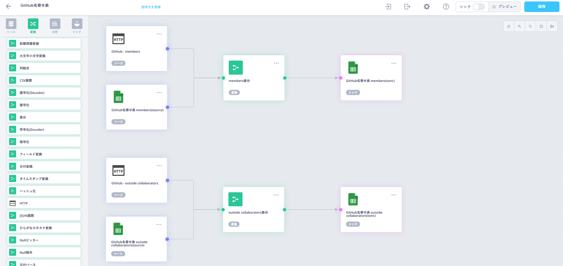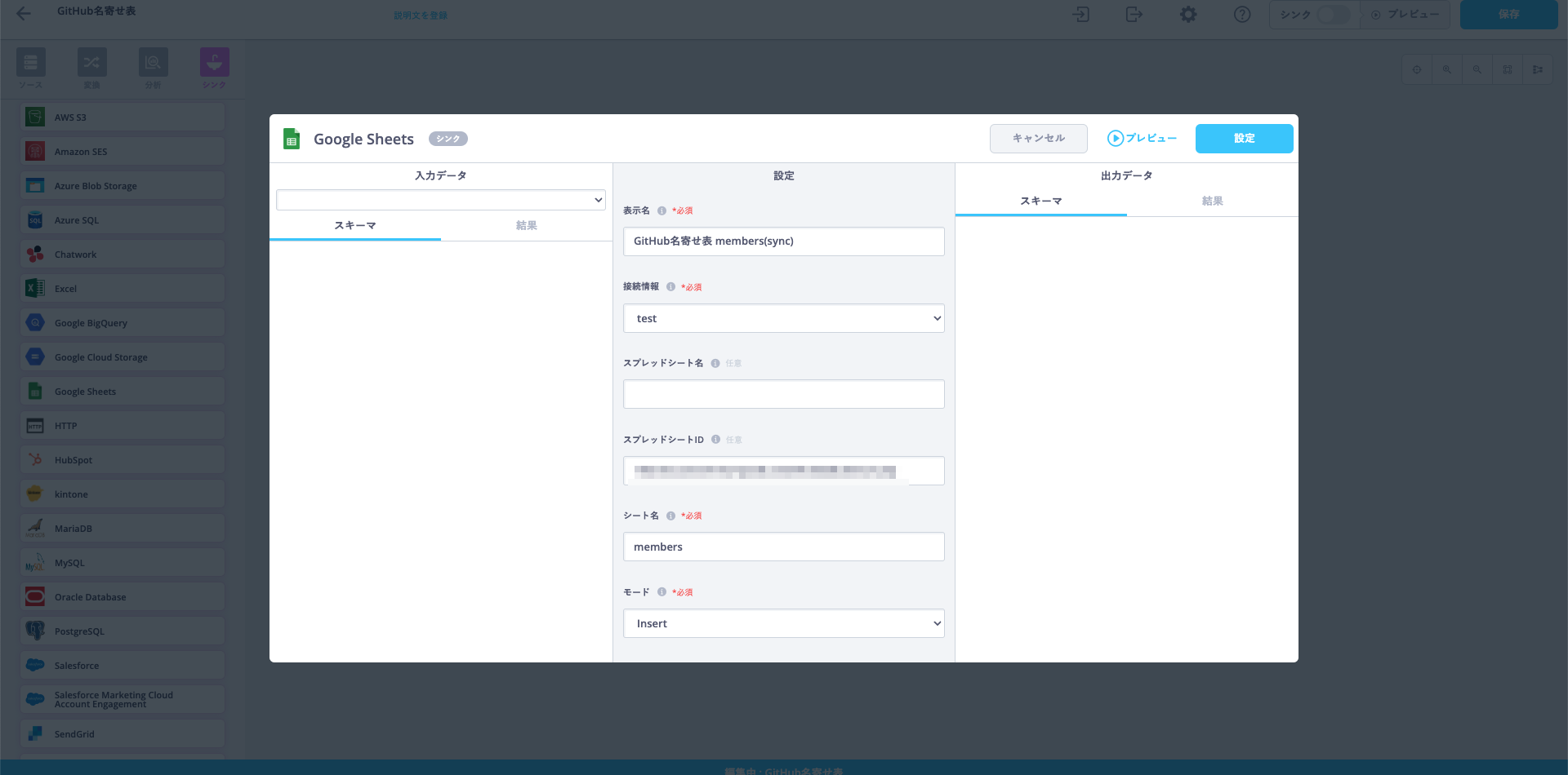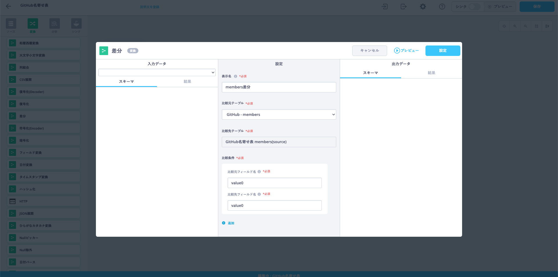 ReckonerはETLなのでデータの加工も当然ながらできます。今回はGoogle SpreadsheetとGitHub APIの差分を取って、それをInsertするようにします。