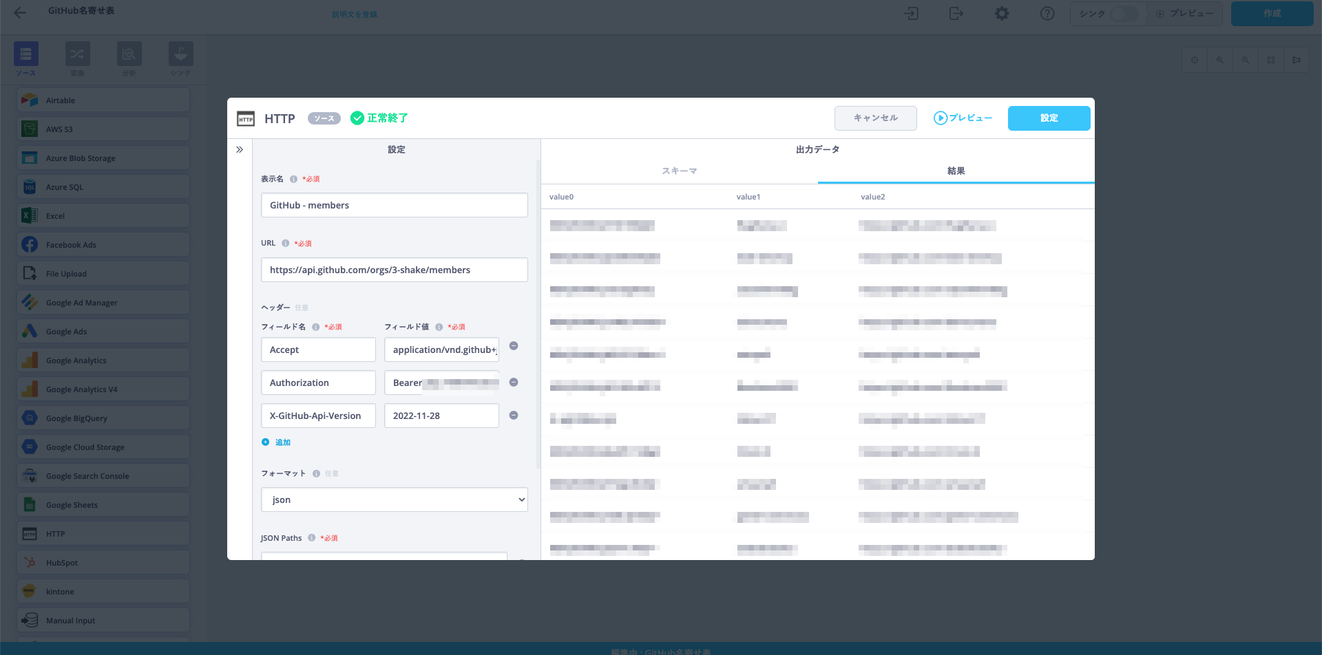 接続できるアプリケーションにはGoogle Spreadsheetを始め、DWHやDB、KintoneやSlackなんかも使えたりします。